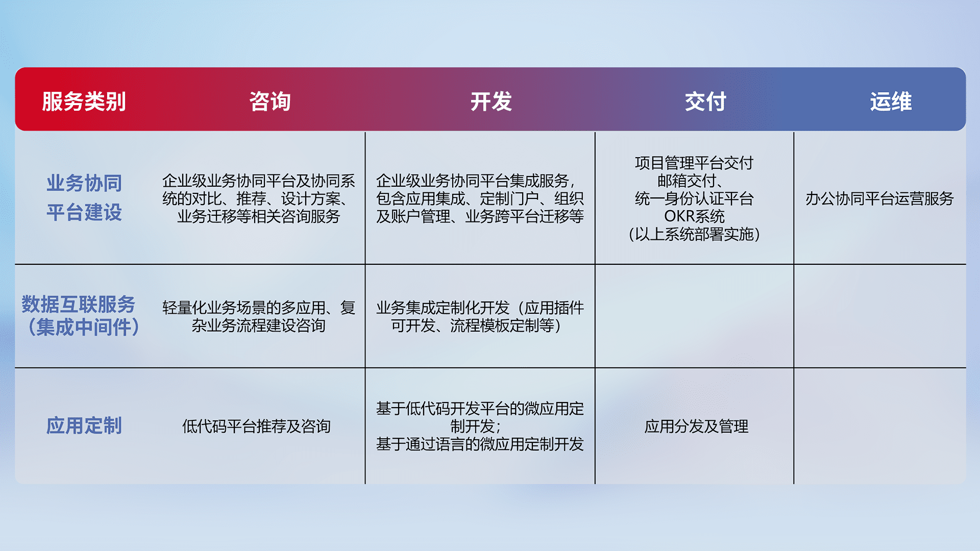 针对钉钉、、企微、、、IDaas等平台级产品提供产品的规划、、方案、、交付、、定制化开发等服务,,,,实现如统一协同办公、、、、智能客户服务、、混合会议管理、、智能数据查询、、、等业务场景,,,,实现数字化转型。。