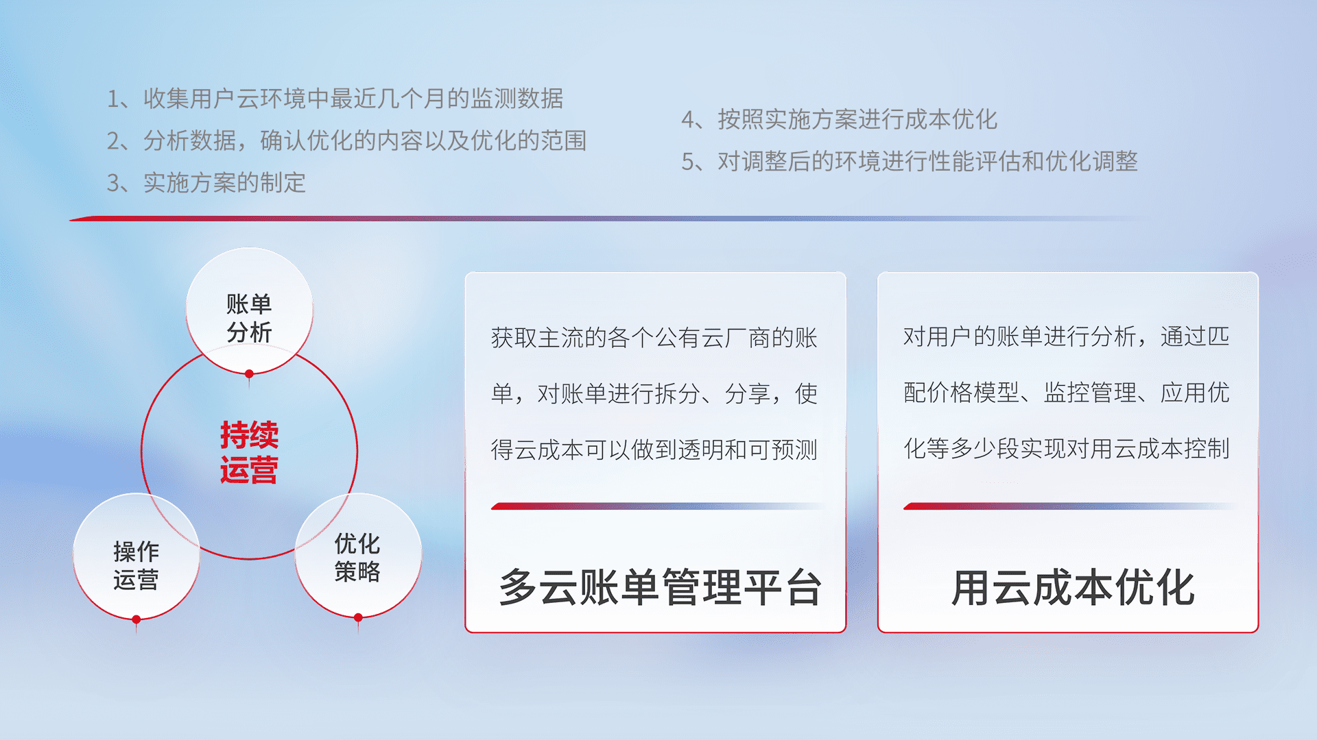通过多云纳管,,,以统一的资源数据模型把客户的云资源进行抽象和封装,,,进而实现对多云资源的统一操作,,,,保障云资源管理的可靠性、、、稳定性与可用性。。量身定制化运维内容,,配置、、开发运维、、、补丁管理、、、、备份、、监控、、、认证和访问管理、、、审计和日常巡检等,,保障在用云过程中的可靠度,,,稳定度以及高可用率。。。